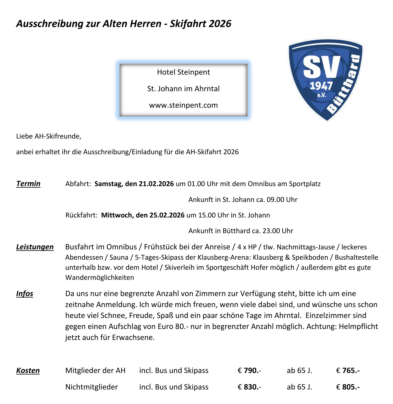 "... der geilste Club der Welt" SV Bütthard1947 e. v. „. . . der geilste Club der Welt“ SV Bütthard 1947 e. V. Aktuelle Spiele Alles auf eine Blick: Wer spielt wann, gegen wen und wo! Laden… Neueste Termine | Informationen 1 Hilfe Kurs im Januar für Mitglieder des SV Bütthard weiterlesen AH Skifahrt vom 21.02.26 – 25.02.2026 ins Ahrntal weiterlesen Kartenvorverkauf21.12.2025 im Rathaus nach dem Weihnachtskonzert Folgt uns auf den Social Media Kanälen Die Auswertung der Umfrage 2025 Bitte auf das Bild klicken um es zu vergrößern und zu navigieren!22. August 2025: Veröffentlichung 1. Teil26. August 2025: Veröffentlichung 2. Teil04. September 2025: Veröffentlichung 3. Teil08. September 2025: Veröffentlichung 4. Teil22. September 2025: Veröffentlichung 5. Teil29. September 2025: Veröffentlichung 6. und letzter Teil! Unsere ONLINE-SHOPS Unser Online-Shop von Fan12Alles von Baby-Outfits bis zur Grillzangewww.sv-buetthard.fan12.de Sport SallerUnser Partner in Sachen Trikots und Trainingsanzügewww.sport-saller.de Kontakt Sie oder Ihr Kind haben Interesse an einem Probetraining? Oder Sie wollen Informationen über das Sportheim oder haben sonstige Fragen? Kontakt Vereinsheim zu vermieten Sie planen eine Familienfeier? Wir stellen die Räumlichkeiten des SVB-Vereinsheimes Mitgliedern und auch Nichtmitgliedern für private Veranstaltungen zur Verfügung Weitere Informationen Unser Partner für das leibliche Wohl: Metzgerei Weid aus Riedenheim • Eigene Schlachtung in Riedenheim • Alle Fleisch- und Wurstprodukte aus eigener, traditioneller Herstellung • Lokale Tierherkunft um Riedenheim • Kürzeste Transportwege – keine langen Tiertransporte • Eigene Stallung im Betrieb für Tiere. www.metzgerei-weid.de Offizieller Teamausrüster