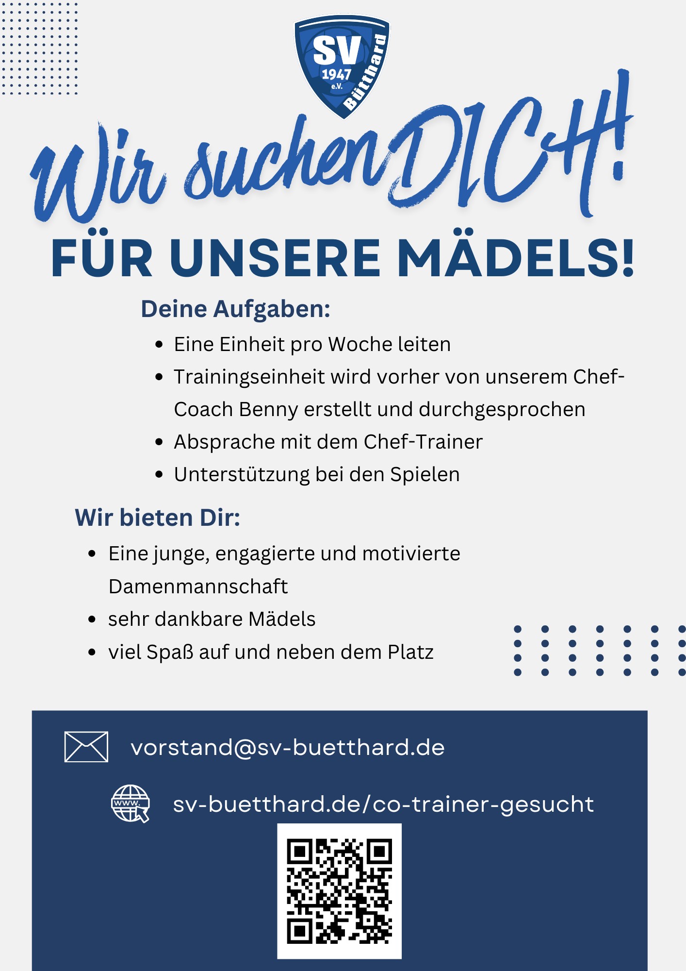 Co-Trainer für unsere Damen gesucht Interessiert? Dann schreib uns! Bitte aktiviere JavaScript in deinem Browser, um dieses Formular fertigzustellen.Name *VornameNachnameTelefonnummer die Nachricht Anschreiben E-Mail-Adresse *Anschreiben / Nachricht an die VorstandschaftAbsenden