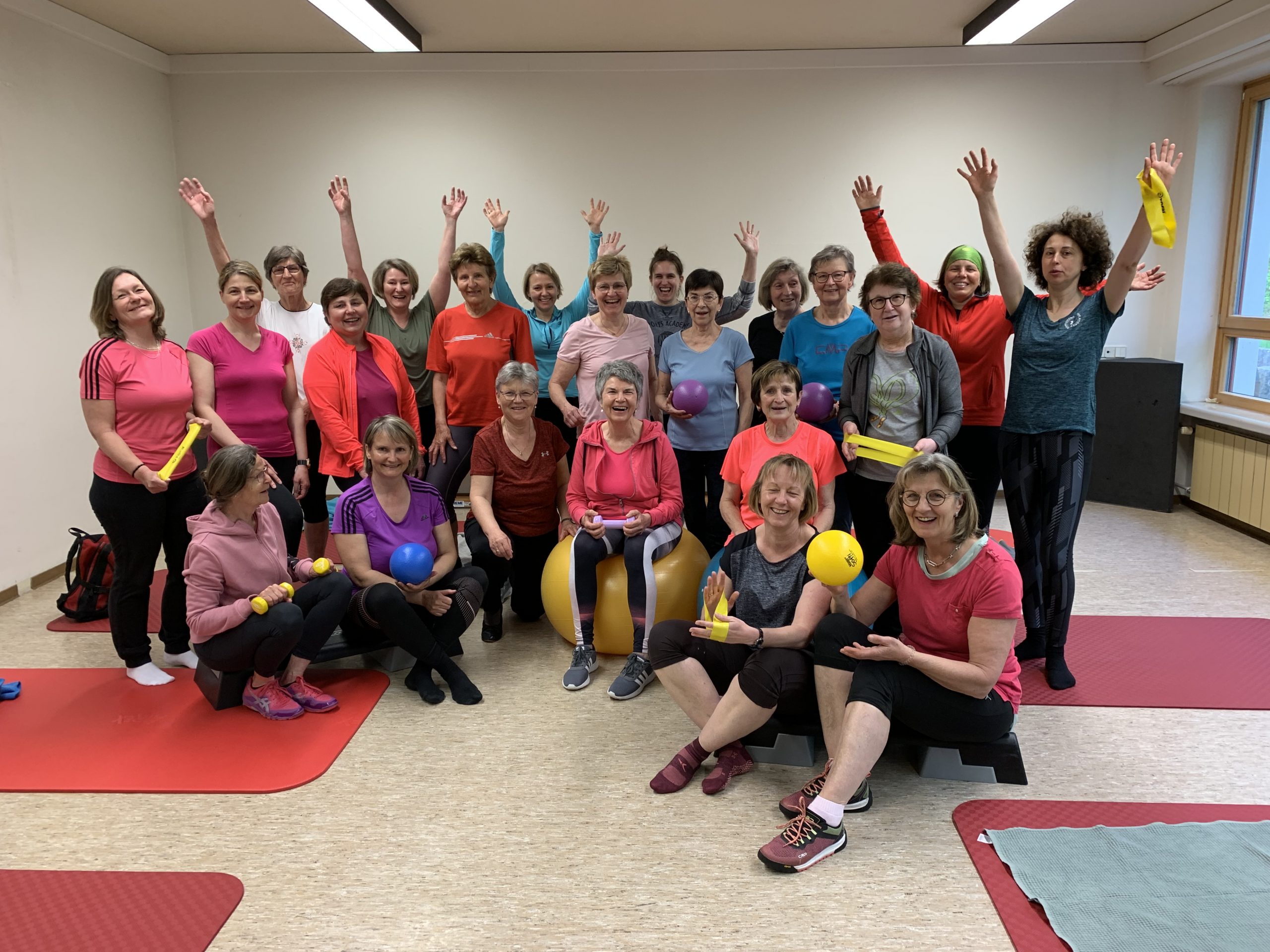 Wir bieten ein buntes Programm mit Elementen aus Krafttraining, Ausdauertraining, Training mit Kleingeräten, Pilates und Yoga.